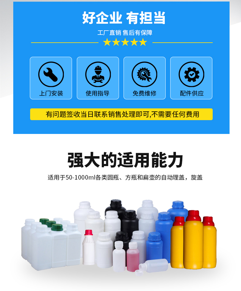 1、通用性強(qiáng):適用于50-1000ml各類圓瓶、方瓶和扁壺的自動(dòng)理蓋,旋蓋;