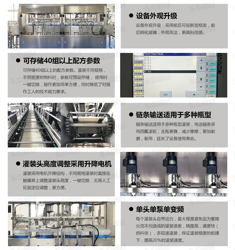 該系列灌裝機(jī)采用容積式計量灌裝原理,多項專利認(rèn)證,適用于各種規(guī)格(1-5L)的液體肥等液體灌裝。設(shè)備采用伺服驅(qū)動活塞計量,保證了 1‰的灌裝精度,在保證灌裝精度的同時,提高了 20%-35%的灌裝速度,操作簡單,維護(hù)方便,節(jié)省人工成本,生產(chǎn)效率更高。