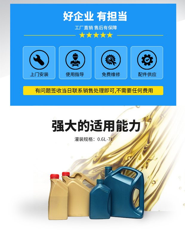 600KG,內(nèi)部設有阻擋板,避免油品輸入過程油品外冒,同時保證灌裝精度;儲油箱位置設在灌裝機頂部,自帶可視液位計,頂部箱蓋大包圍設計并且可以打開,具備排氣功能(排出氣泡等);灌裝頭整體上升方式平穩(wěn),不產(chǎn)生震動,高度及寬度可調(diào)。