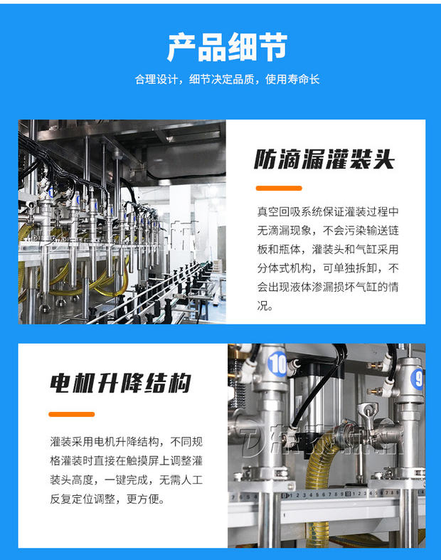 過程中無滴漏現(xiàn)象,不會污染輸送鏈板和瓶體,灌裝頭和氣缸采用分體式機構,可單獨拆卸,