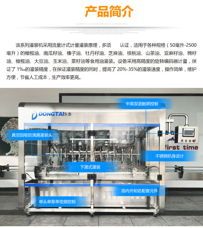 該食用油灌裝機采用流量計式計量灌裝原理,多項認證,適用于各種規(guī)格(1-5升)的南瓜籽油、榛子油、牡丹籽油、芝麻油、核桃油、山茶油、亞麻籽油、棉籽油、橄欖油、大豆油、玉米油、菜籽油等食用油灌裝。設(shè)備采用高精的旋轉(zhuǎn)編碼器計量,保證了1%o的灌裝精度,在保證灌裝精度的同時,提高了20%-35%的灌裝速度,操作簡單,維護方便,節(jié)省人工成本,生產(chǎn)效率更高。