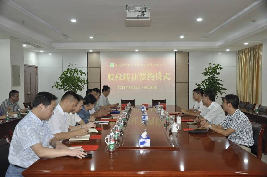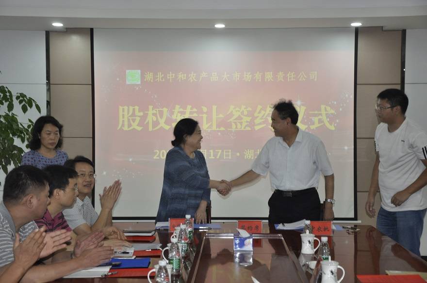 9月17日上午,湖北中和農(nóng)產(chǎn)品大市場有限責任公司股權轉(zhuǎn)讓簽約儀式在仙桃順利舉行。儀式由湖北省供銷社社有資產(chǎn)經(jīng)營管理公司副總經(jīng)理張永海主持,中國供銷農(nóng)產(chǎn)品批發(fā)市場控股有限公司總經(jīng)理張生與湖北合作投資集團有限公司黨委書記、董事長、總經(jīng)理嚴莉敏代表雙方現(xiàn)場簽約轉(zhuǎn)讓協(xié)議,湖北省供銷社企業(yè)處、財資處相關領導,中農(nóng)批公司、投資集團和湖北中和公司部分干部職工出席簽約儀式。